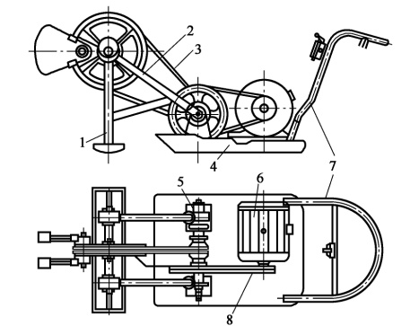 1-夯頭;2-夯架;3、8-三角帶;4-底盤(pán);5-傳動(dòng)軸架;6-電動(dòng)機(jī); 7-扶手