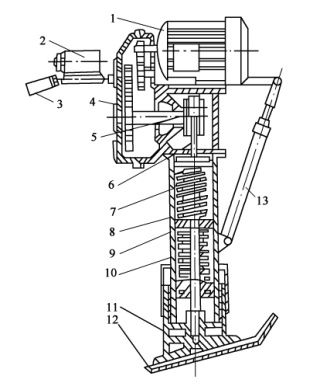1-電動(dòng)機(jī);2-電氣開(kāi)關(guān);3-操縱手柄;4-減速器;5-曲柄;6連桿;7-內(nèi)套筒;8-機(jī)體;9-滑套活塞;10-螺旋彈簧組;11底座;12-夯板;13-減振器支承器
