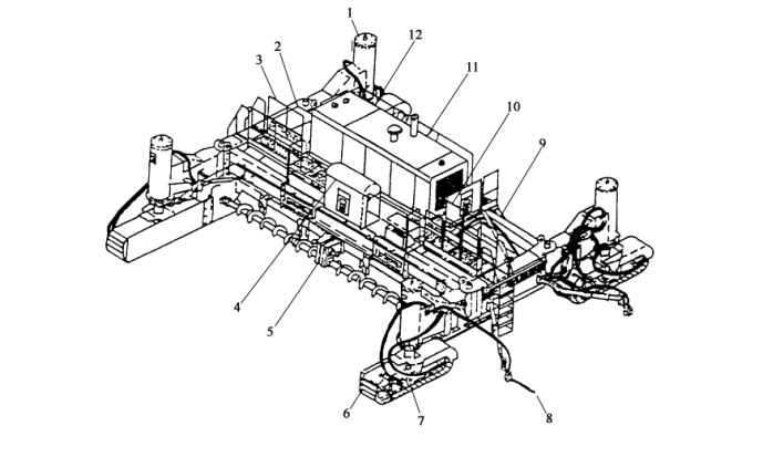 1-浮動(dòng)支腿;2-噴灑水系統(tǒng);3-固定機(jī)架;4-操作控制臺(tái);5-攤鋪裝置;6-行走轉(zhuǎn)向裝置;7-自動(dòng)轉(zhuǎn)向系統(tǒng);8-自動(dòng)找平系統(tǒng); 9-伸縮機(jī)架;10-人行通道;11-動(dòng)力系統(tǒng);12-傳動(dòng)系統(tǒng)