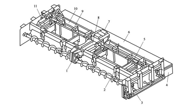 1-螺旋分料裝置;2-計(jì)量裝置;3-側(cè)模裝置;4-修邊器;5-內(nèi)部振搗裝置;6-定型抹光裝置;7-拱度調(diào)節(jié)設(shè)置;8-中間支梁; 9-外部振搗裝置;10-成型裝置;11-兩端支梁