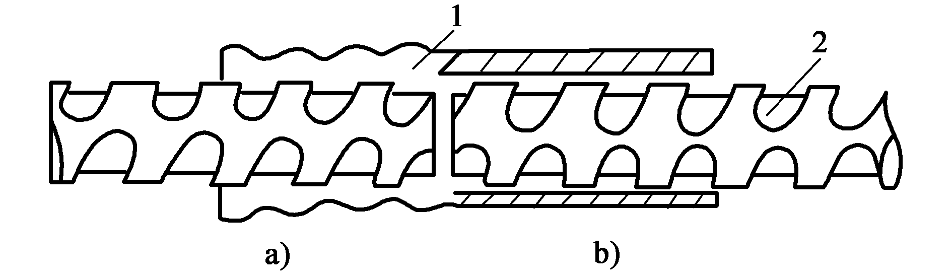a)已擠壓部分;b)未擠壓部分1鋼套筒;2帶肋鋼筋