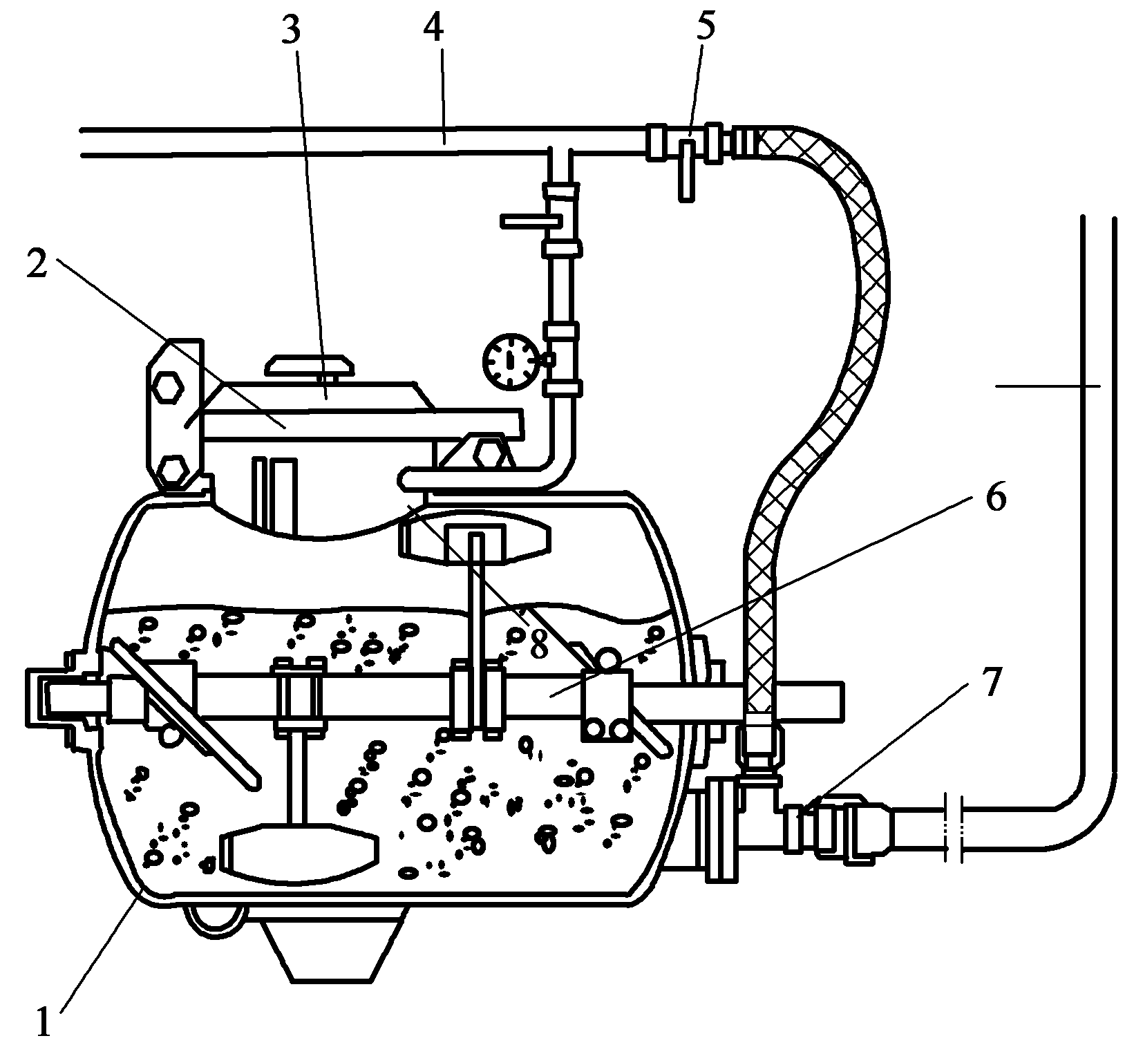 1.壓力缸;2.進料口;3.壓蓋;4.壓縮空氣管道;5.開關;6.攪拌軸;7.出料口;8.輸出管道